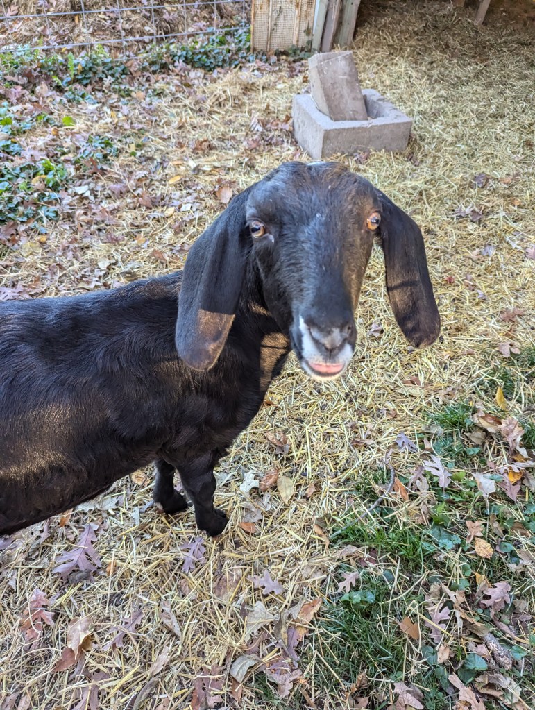 Misty is our lap goat. She was born in 2023–we exposed her in fall of 2024 and expect her first kidding spring 2025! Ever since the day she came home to us, her favorite thing is for me to sit in a lawn chair so she can get in my lap. She loves her people–I think this is in part because she is the only one of our herd that didn’t come with an immediate relative, so she bonded very strongly with us.