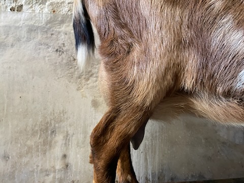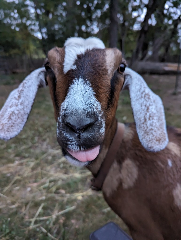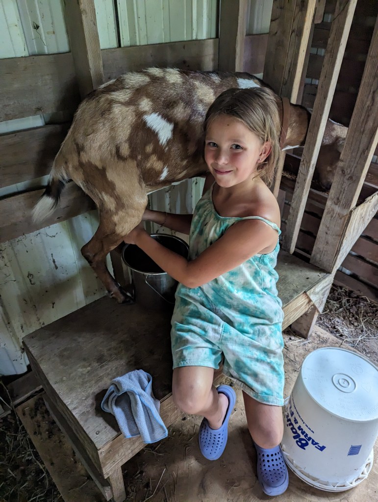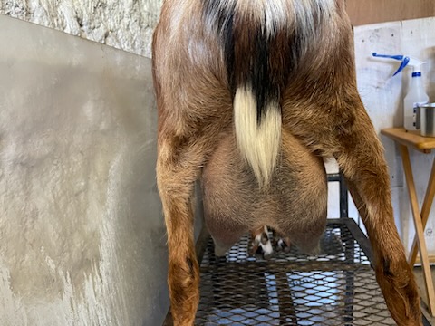 Starla is a sweet girl with a big personality and delicious milk. She is our herd mama and keeps all the younger goats in line. Starla thrives on routine–great on the milk stand and loves attention from her trusted people.