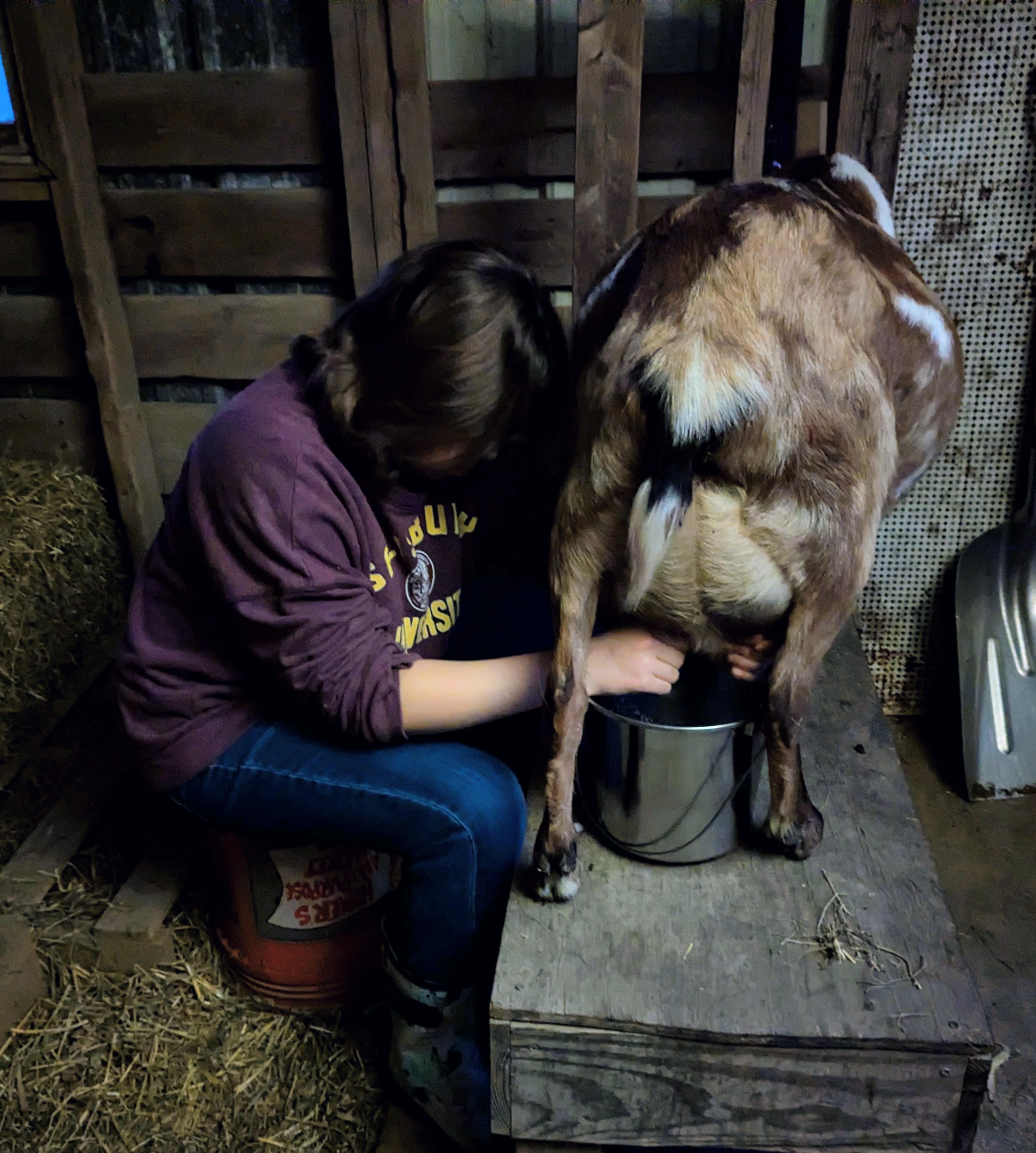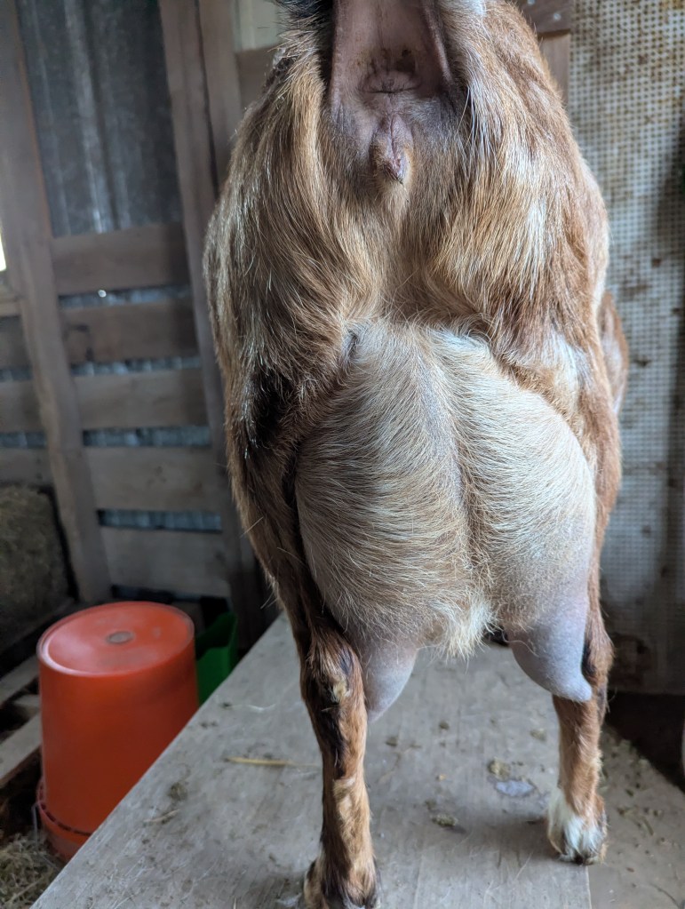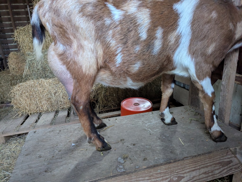 Starla is a sweet girl with a big personality and delicious milk. She is our herd mama and keeps all the younger goats in line. Starla thrives on routine–great on the milk stand as long as you keep her snack bowl filled and loves attention from her trusted people.
